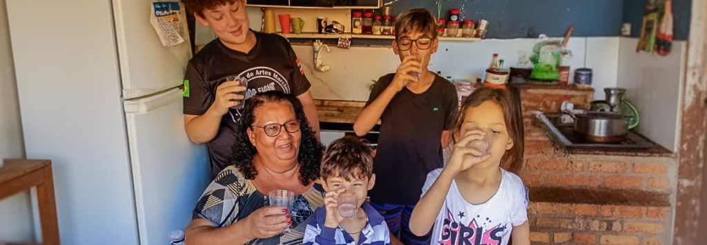Antes, dona Fátima precisava ir até o córrego para dar banho nas filhas. Hoje, seus netos crescem com chuveiro quente, água tratada e saúde. A mudança veio com o aumento da rede de coleta e tratamento de esgoto.